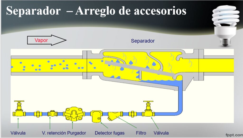 - Purgador de aire/gases no condensables (vent termostático) en la parte superior si el separador no lo incluye.
